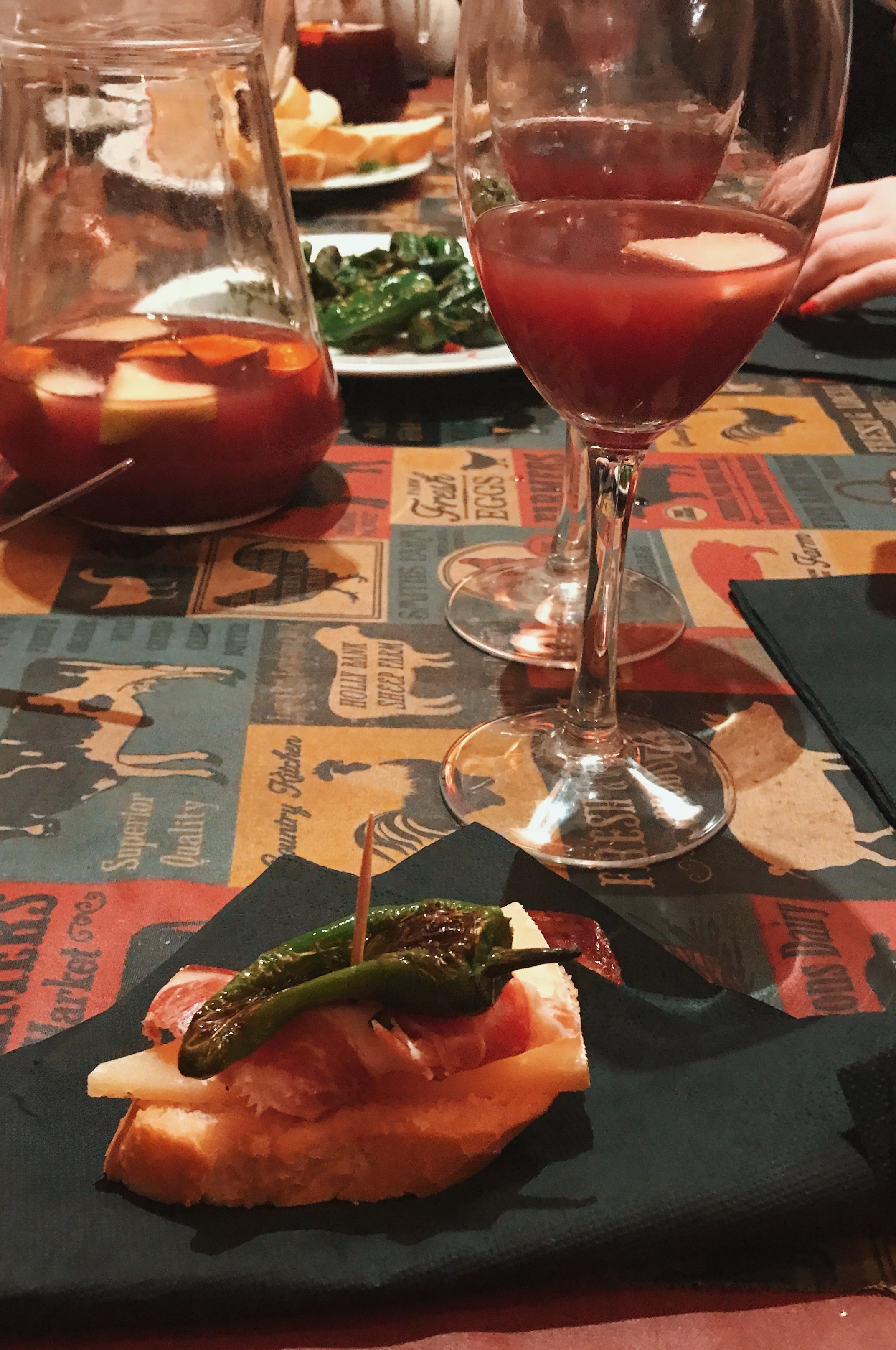 My friends and I got the full Paella experience one night in Barcelona when we signed up for a cooking class. The class began with instruction on how to put together pinchos. First we took small pieces of bread and grated a tomato on top, similar to when making Catalan tomato bread. Then we drizzled olive oil and sprinkled salt and pepper on top. Following that, we placed a slice of cheese and Iberian ham, topping it off with a Padrón pepper. We then finished the pincho by sticking a tooth pick through the center to hold the ingredients together.