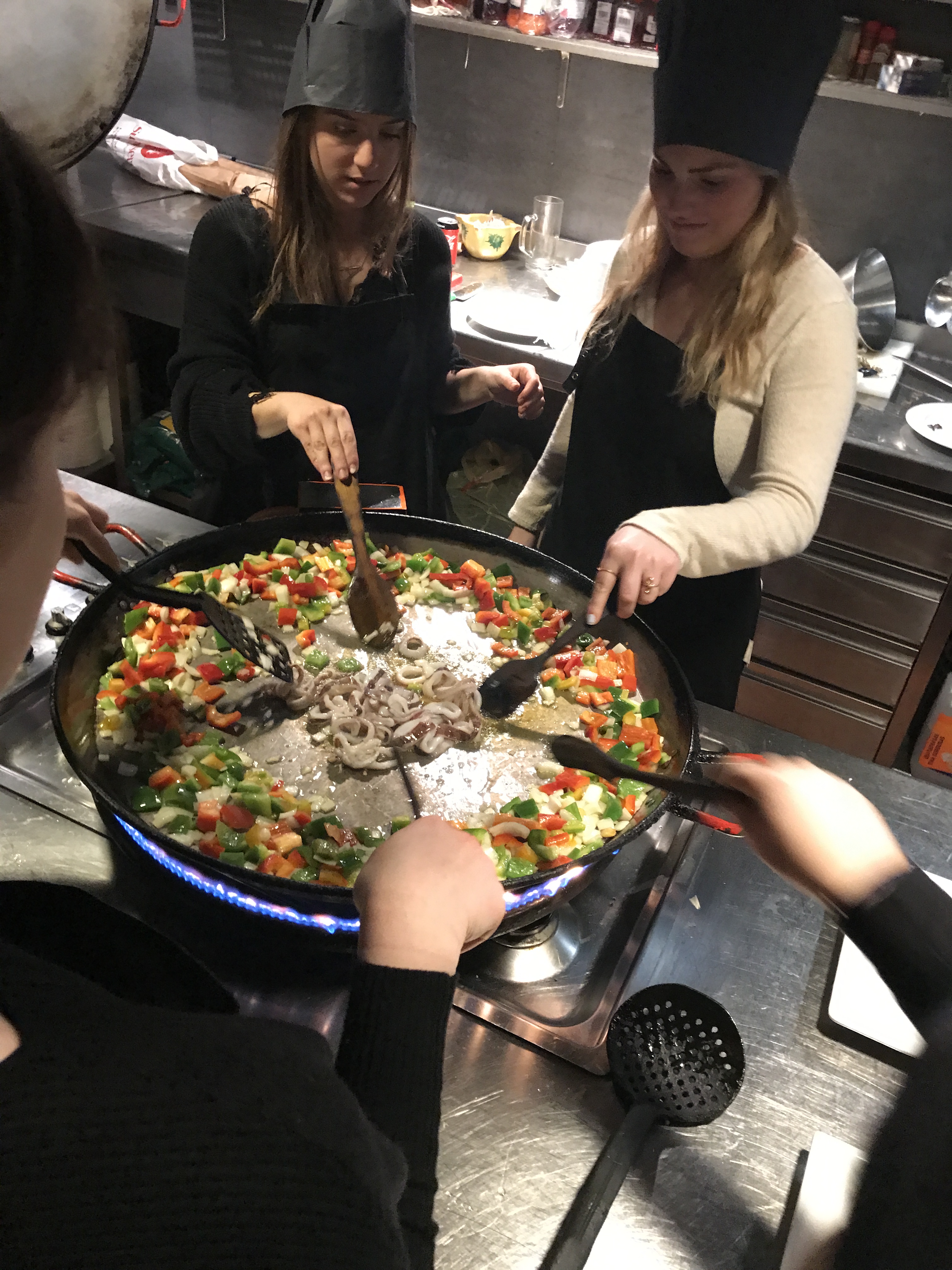Before the class began, we went, with our instructor, to la Boqueria to pick up our live seafood for the Paella. The class was split in half, some to prepare the seafood and the others to cook the dish. I was placed in the first group and was given the opportunity to prepare the seafood. I was instructed on how to gut a squid and pull the legs and heads off the prawns. I also helped tap each of the mussels to make sure they were still living before we cooked them. This experience made me squirm a little because I had never dealt with live seafood before, but I really appreciated seeing the process of paella from start to finish.